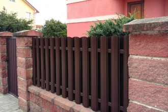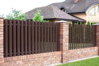 Заборы из металлического штакетника с кирпичными столбами в Люберцах
